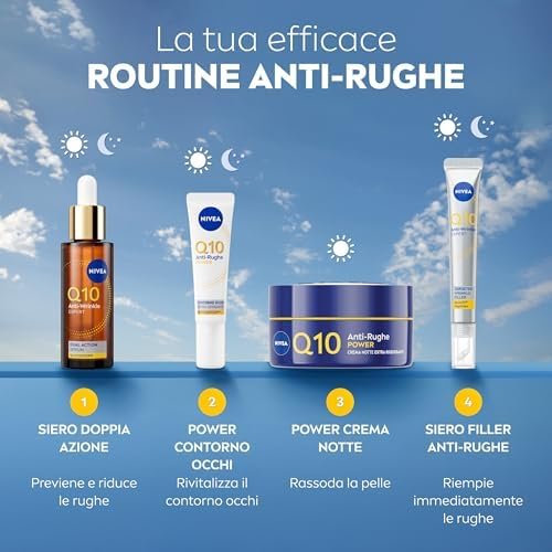 Nivea Q10 crema notte. Ottima consistenza, idrata benissimo, non appesantisce la pelle, delicato profumo. Contiene acido ialuronico e creatina che idratano e rassodano la pelle. La mattina la pelle risulta morbida e riposata. A me piaciuta, posso consigliarla. Nivea e una garanzia. Ottimi prodotti con i costi acessibili. Ovviamente ci vuole la costanza per vedere i risultati.